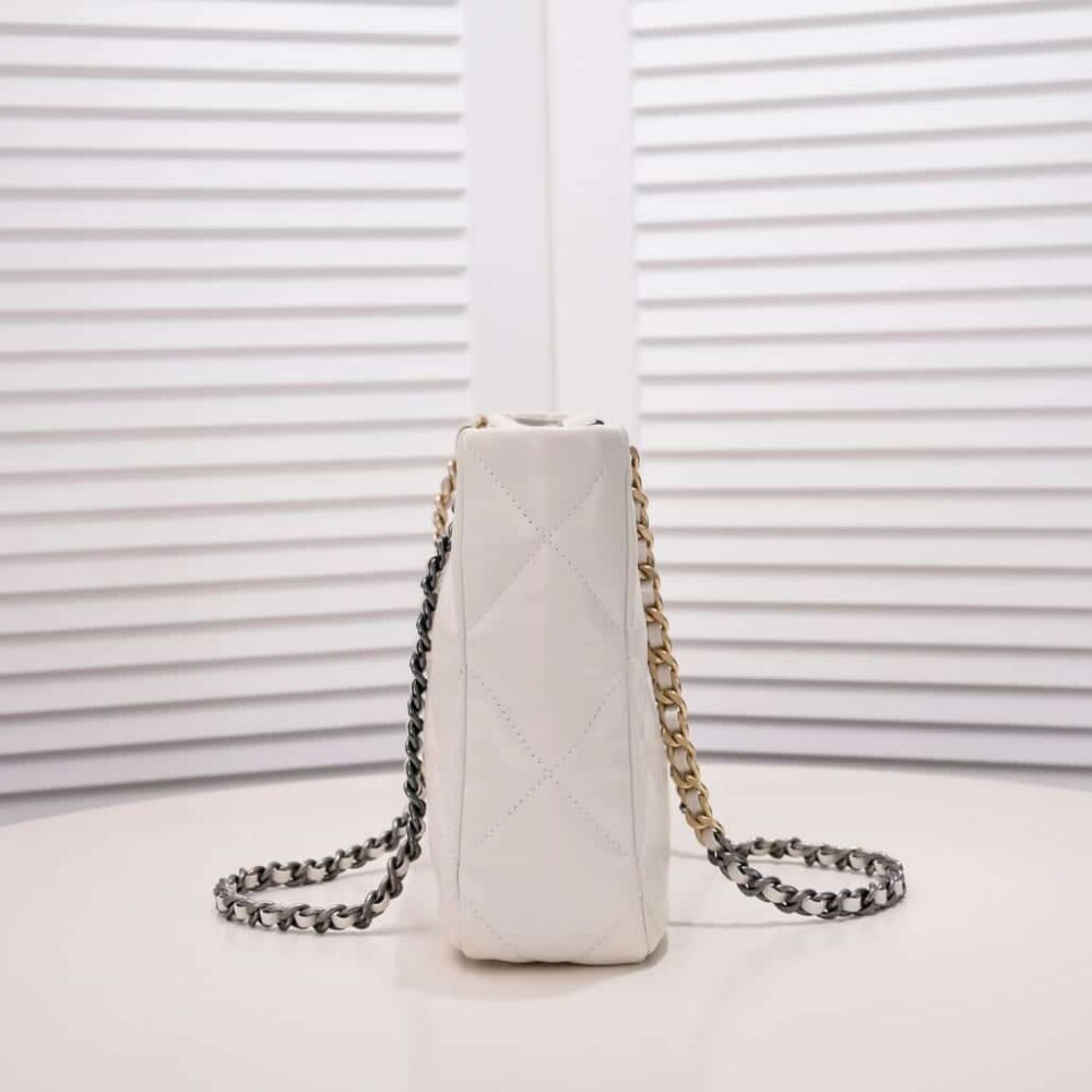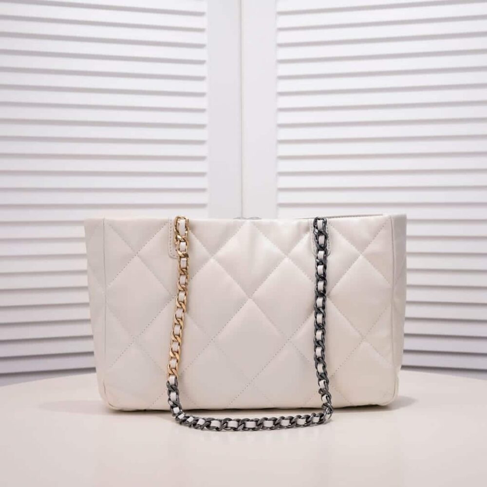 The Chanel Quilted 19 East West Shopping Bag in white captures timeless elegance with a modern, elongated silhouette adorned by signature quilting and delicate chain detailing. A symbol of effortless sophistication, it elevates every look with prestige and iconic allure, affirming your refined sense of style.