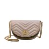 This is the Gucci GG Marmont Matelassé Half-Moon Shaped Mini Bag in beige. It features the signature chevron quilting, antique gold Double G logo, and an elegant chain strap. The compact half-moon silhouette makes it both chic and versatile, perfect for elevating any look.