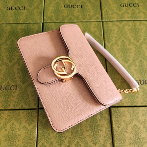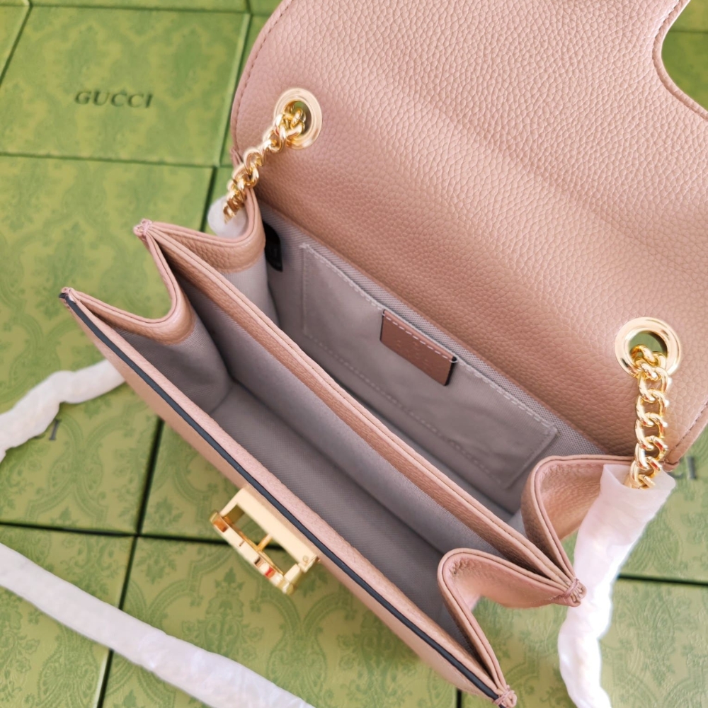 This is a chic shoulder bag from in a soft blush pink shade, offering a feminine yet sophisticated charm. The design features a structured silhouette with a flap closure, highlighted by the iconic interlocking GG logo in gold-tone hardware. Its chain strap adds versatility, allowing it to be worn elegantly over the shoulder or crossbody.
