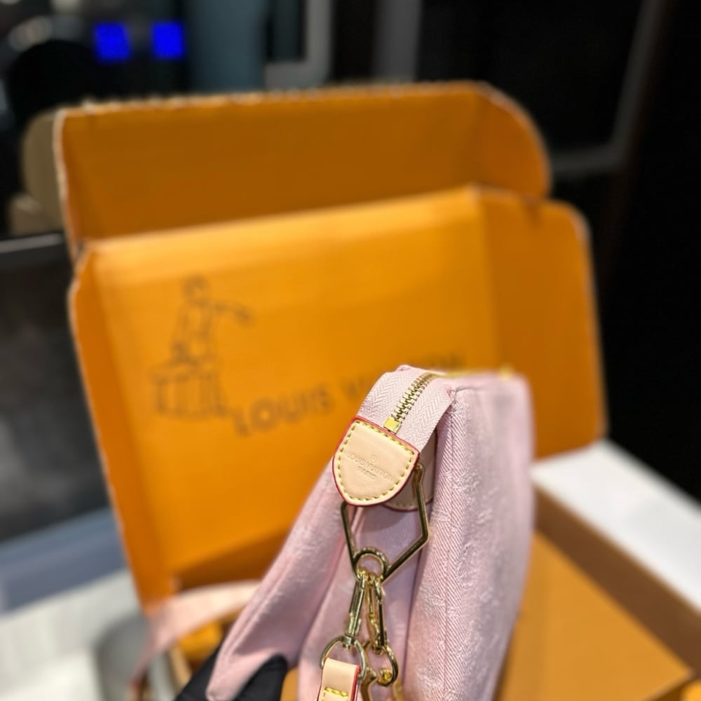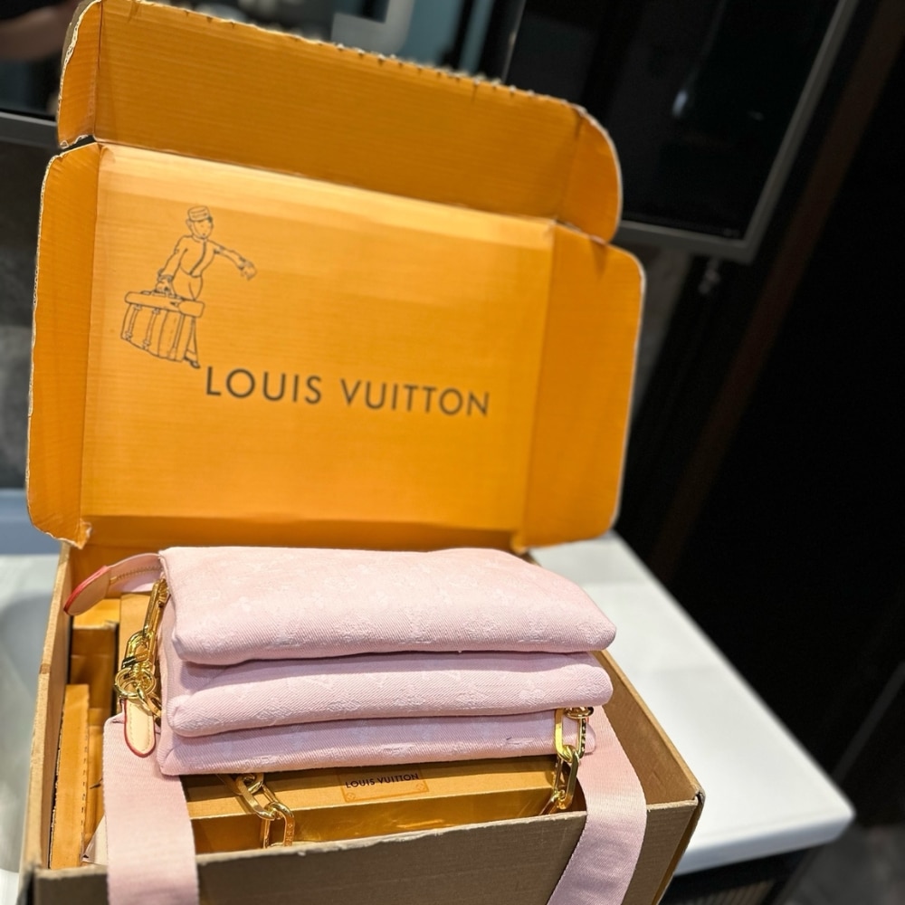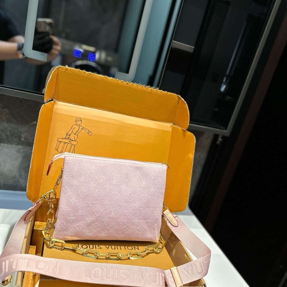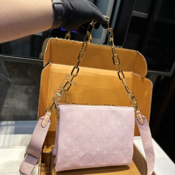 A statement addition to the Coussin line, this PM model showcases the revival of the House’s 2005 Monogram Denim pattern. It is crafted from organic cotton, which is artfully woven on a white base to create a luminous pink finish. The signature chunky LV chain is removable, offering multiple carry options.