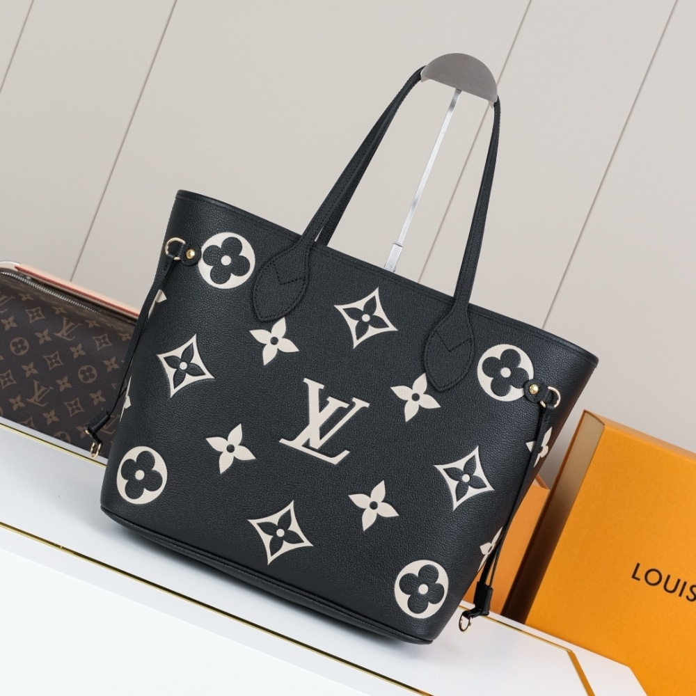 Ideal for everyday use, the roomy Neverfull MM tote bag is made from black cowhide leather with the Monogram pattern embossed then printed in beige on the leather. Cinch the side laces and this tote transforms into an elegant city bag. It can be carried on the shoulder or the elbow, thanks to the long shoulder handles.