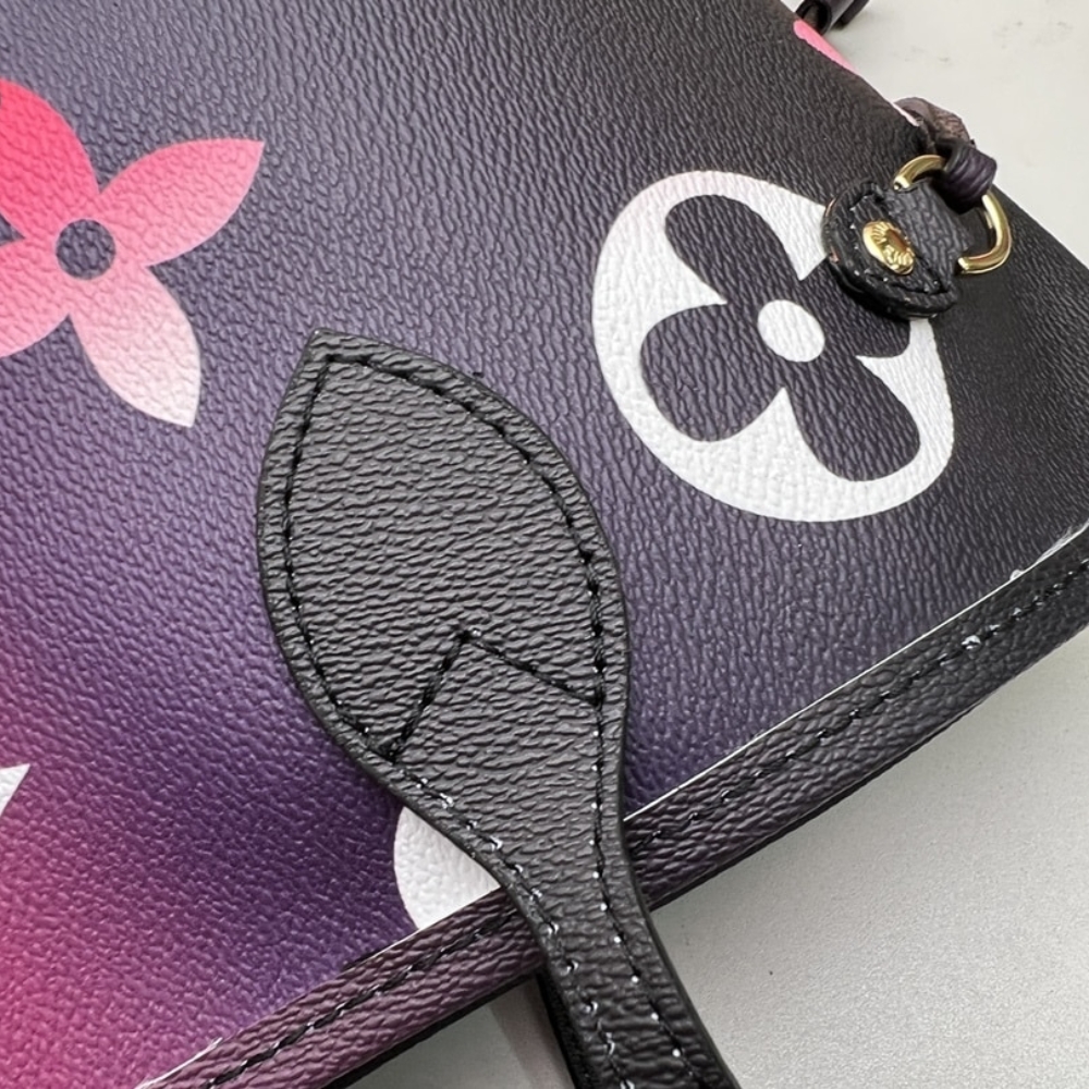 This summery Neverfull MM tote bag is made from Monogram Giant canvas in a gradient pastel colorway and is accessorized with a leather flower charm. The bag’s side laces tighten for a sleek silhouette or loosen for a more casual look. Its interior pouch can be removed and carried used as a clutch while its thin handles slip comfortably over the shoulder or arm.