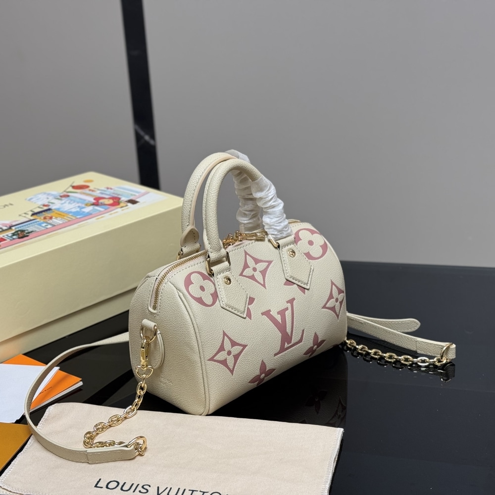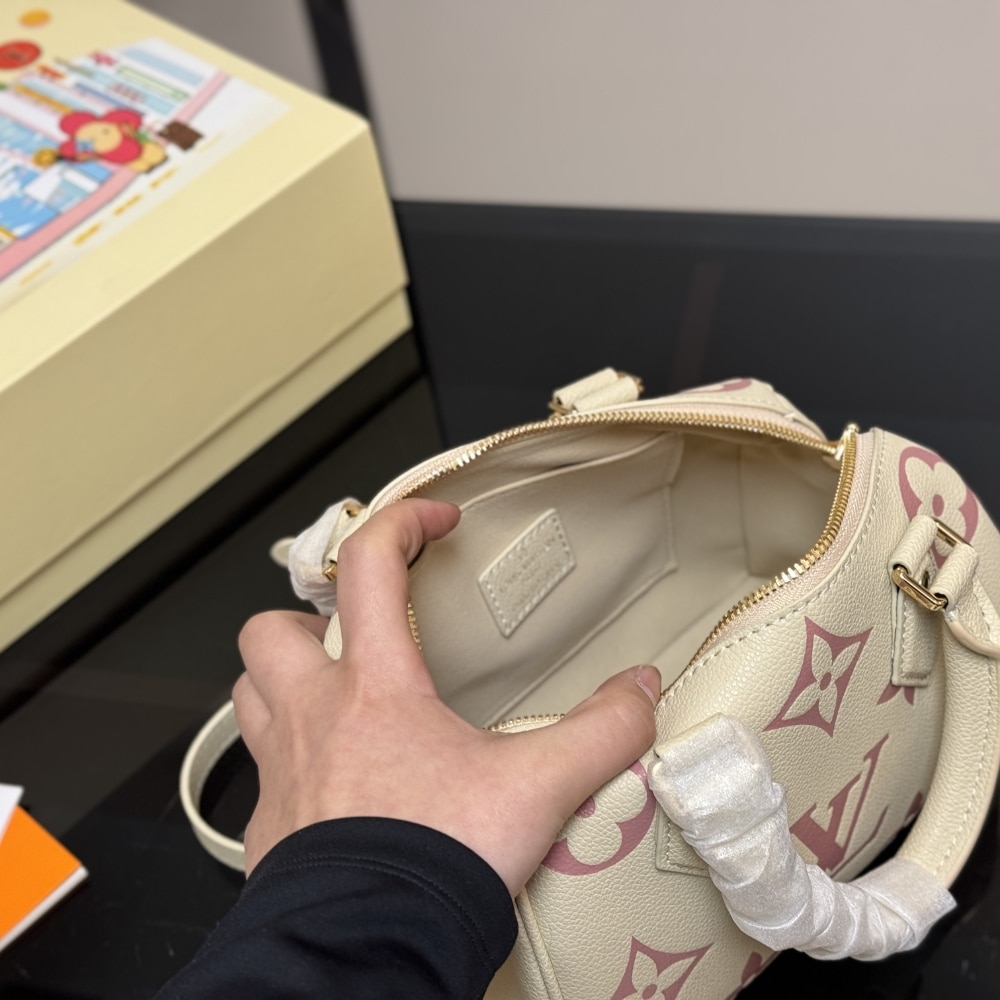 Louis Vuitton Speedy Bandoulière 20 handbag. This specific model is crafted from Monogram Empreinte leather, featuring the iconic Monogram pattern embossed and printed in a bicolor design, such as cream and rose. The bag’s design is inspired by Louis Vuitton’s historic Speedy travel bags, evoking a sense of timeless elegance.