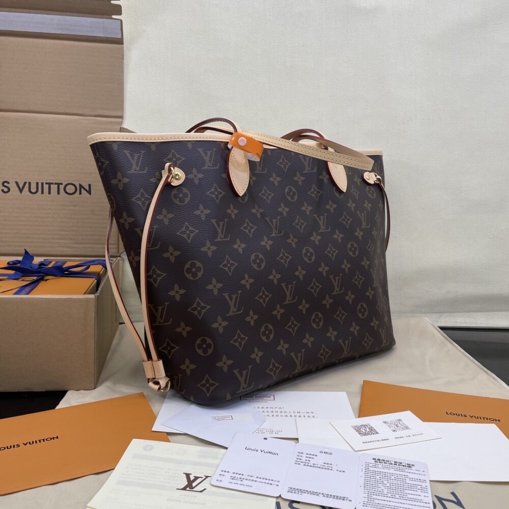 The Neverfull MM tote unites timeless design with heritage details. Made from supple Monogram canvas, it is roomy yet not bulky, with side laces that cinch for a sleek allure or loosen for a casual look. Slim, comfortable handles slip easily over the shoulder or arm. Lined in colorful textile, it features a removable pouch which can be used as a clutch or an extra pocket.