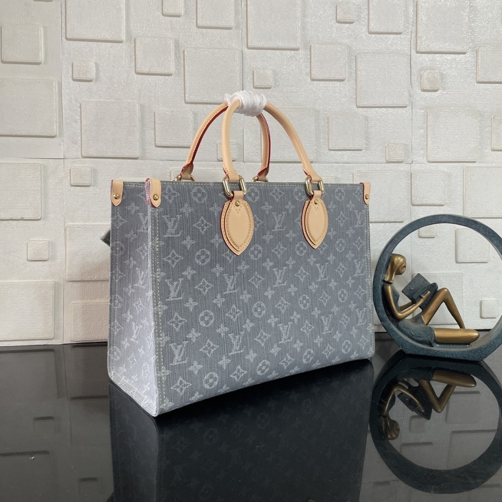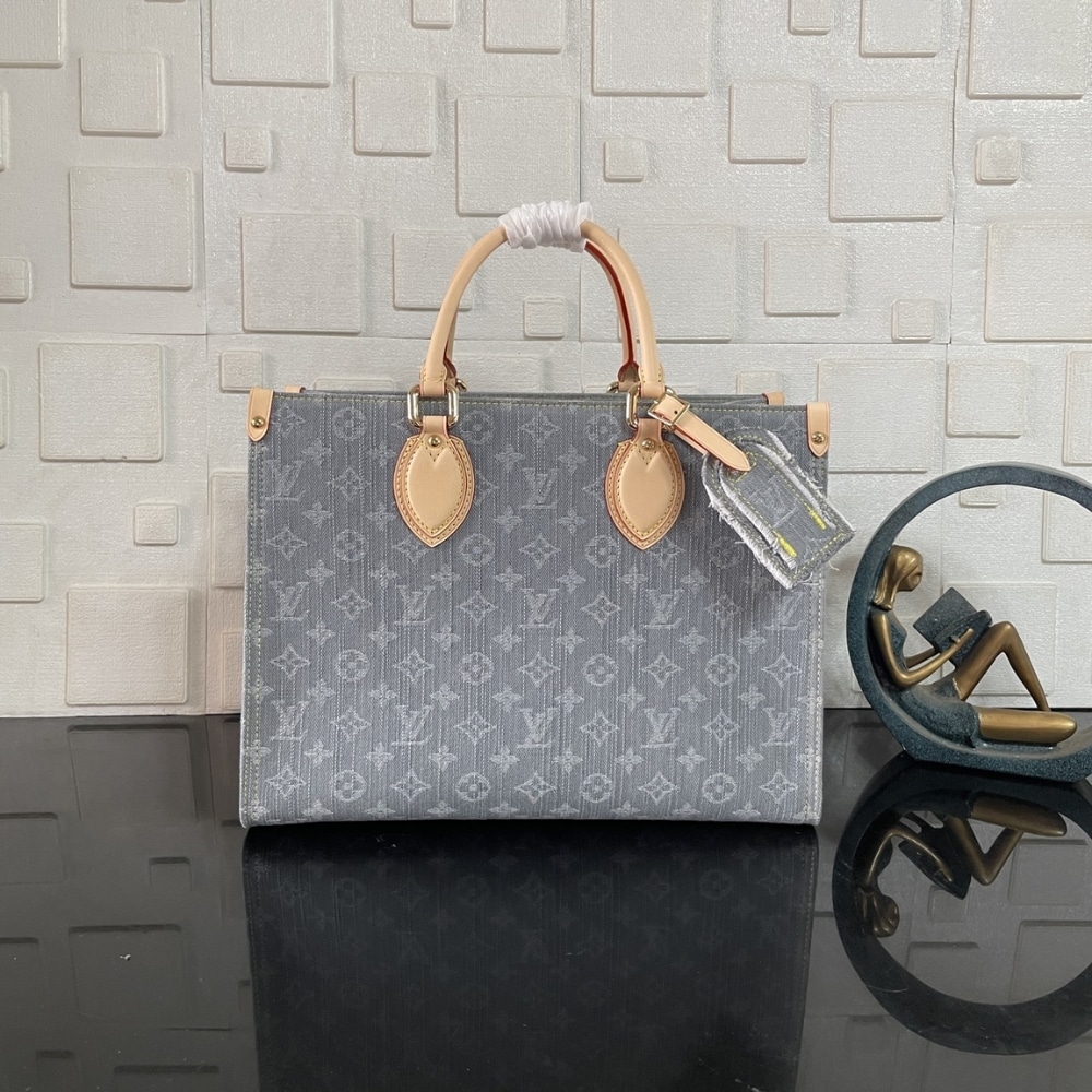 This edition of the OnTheGo MM celebrates the return of the iconic Monogram Denim pattern from 2005. Sized to store a laptop, it is elevated with light gold-toned hardware and includes signature details such as the natural leather trims and a removable name tag.