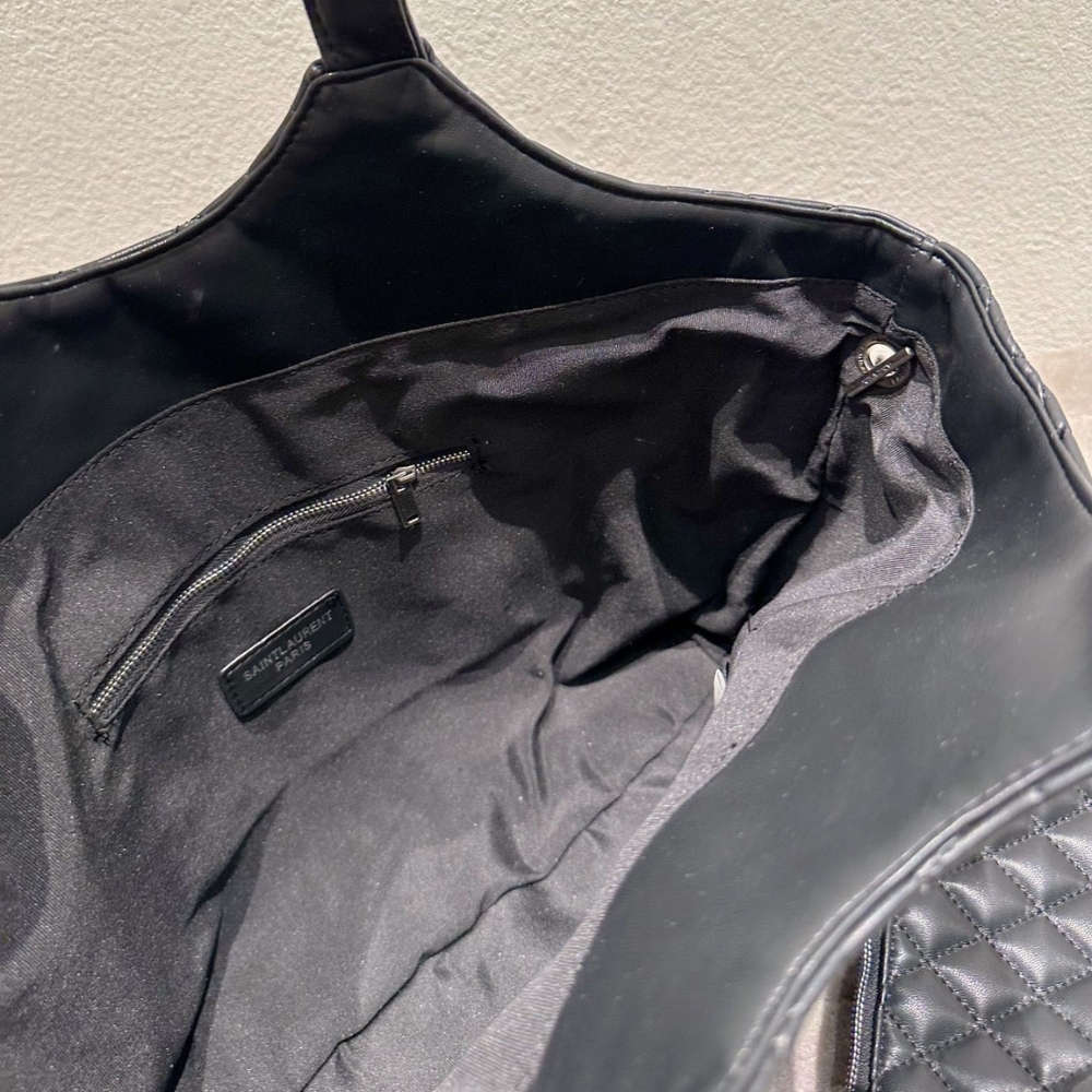 Saint Laurent Icare Shopping Bag In Quilted Black – featuring a diamond-quilted design with oversized YSL silver-tone hardware. The spacious silhouette combines elegance with practicality, perfect for everyday or travel. Comes with a matching pouch for added convenience